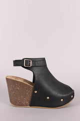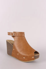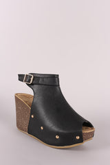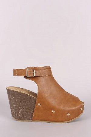 These wedges feature a peep toe silhouette, center seam detail, cutout heel counter with adjustable side buckle closure, studded platform, and faux wooden wedge heel. Finished with a lightly padded insole for comfort.