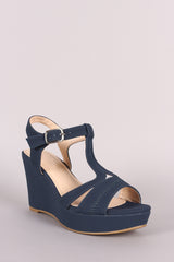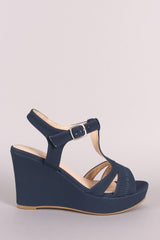 These wedges feature an open toe silhouette, t-strap to an adjustable ankle strap with side buckle fastening, and wrapped platform wedge heel. Lightly padded insole.